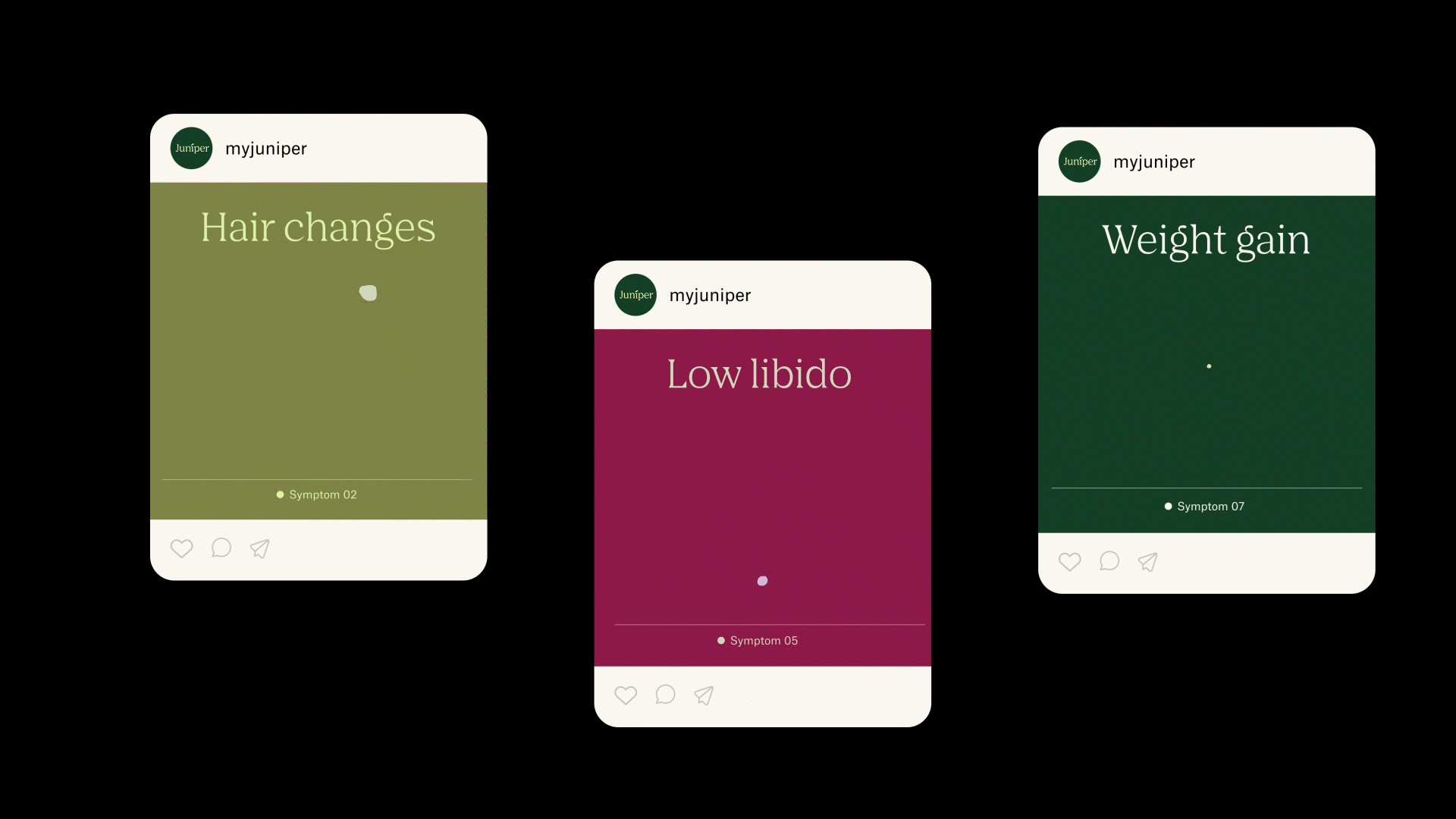 The brand and name we chose for Juniper is inspired by inherent qualities of an evergreen plant — resilience, strength, determination. It's grounded yet delicate, strong but vulnerable, reflecting the character of the many women we heard from when building this business. We use bright, positive imagery paired with natural colours and considered typography. Our illustrations set has both icons inspired by hardy Australian flora to reference the key menopause symptoms, as well as a set of hand drawn female figures to celebrate all types of bodies. The identity is tied together with a light design system, using dots (or berries as we call them) to pull out key information about a product, person or offer and create an identity grounded in clear information.